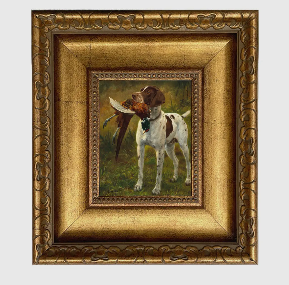 Experience the timeless beauty of a classic English Pointer with Pheasant Painting, an accurate reproduction of the original work by renowned German painter Henry von Reth. Each high resolution image is printed with archival quality ink on matte canvas and board mounted for a more authentic oil painting look. Measures 5” x 6”.