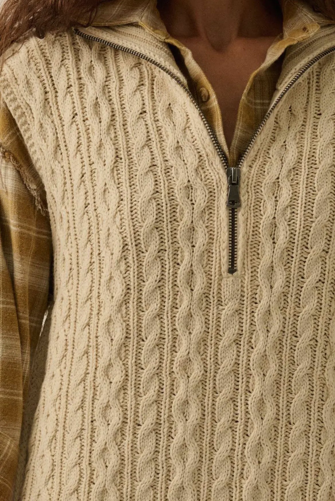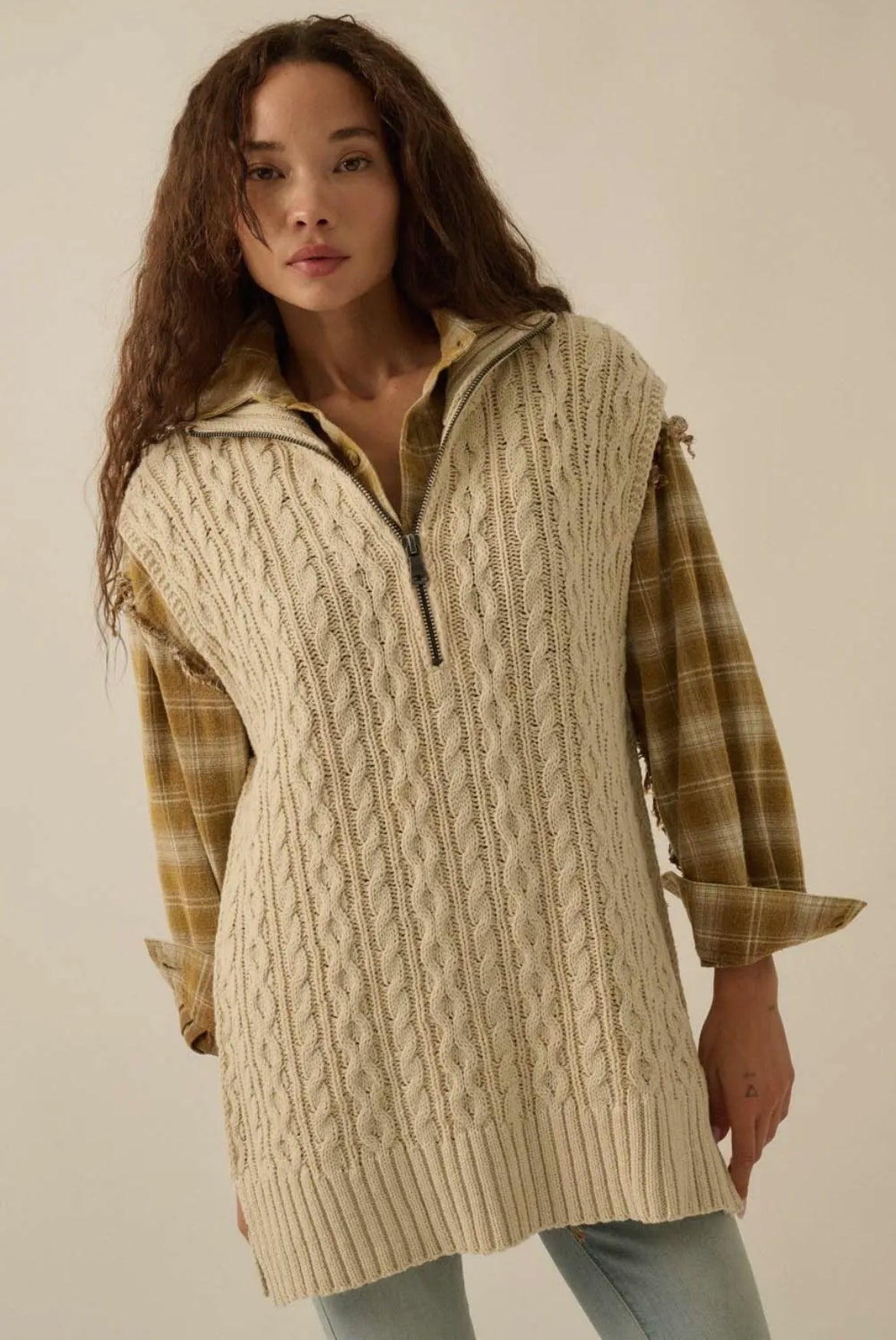 Cable Knit Half Zip Oversized Sweater Vest - Cream