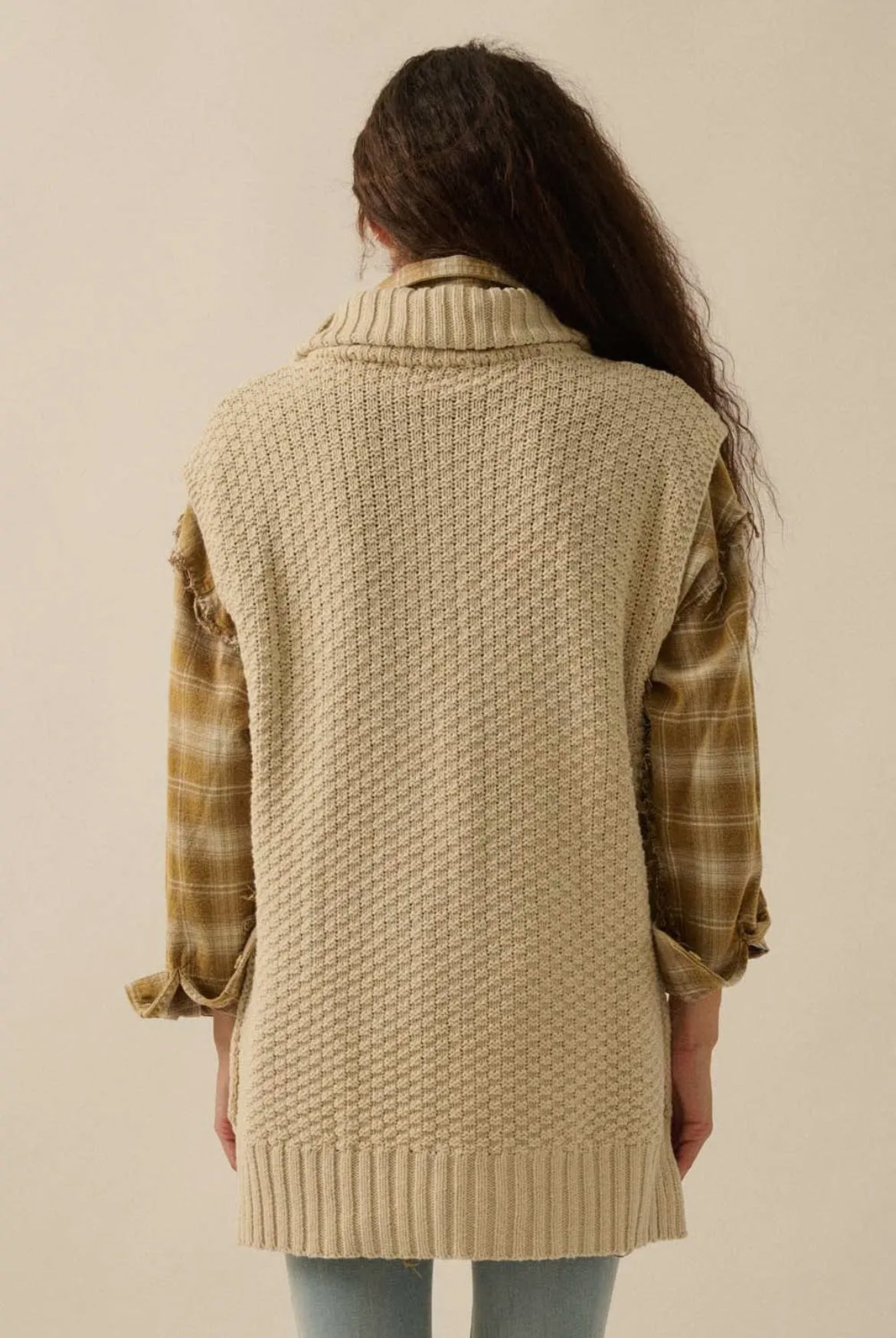 Elevate your winter wardrobe with our Cable Knit Half Zip Oversized Sweater Vest. The side split hem adds a touch of modern flair to the classic cable knit design. Perfect for layering over collared shirts and jeans, or pairing with our "Ellie Tartan Green Plaid Mini Dress" and statement jewelry for a chic and Western inspired look. Dress up your style with this versatile and stylish vest.