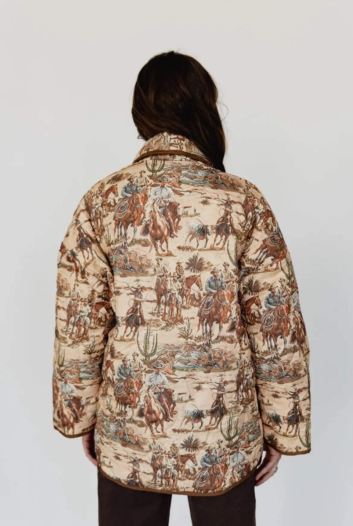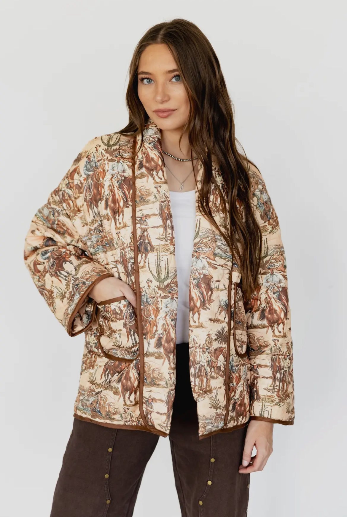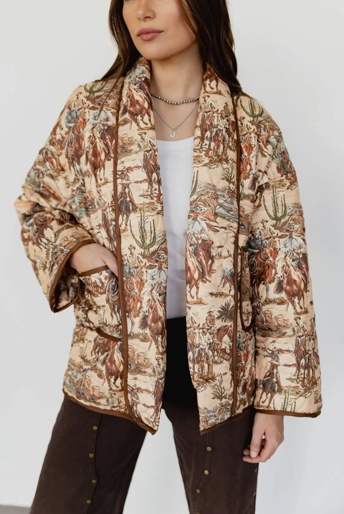 Embrace your inner cowboy with our Quilted Cowboy Jacket. Featuring an allover illustrated desert motif and lightly padded body, this jacket will keep you warm and stylish. The relaxed, cropped fit and open front design add an extra touch of Western flair. Made from a smooth, durable shell with a lightweight fill. Saddle up and make a statement!