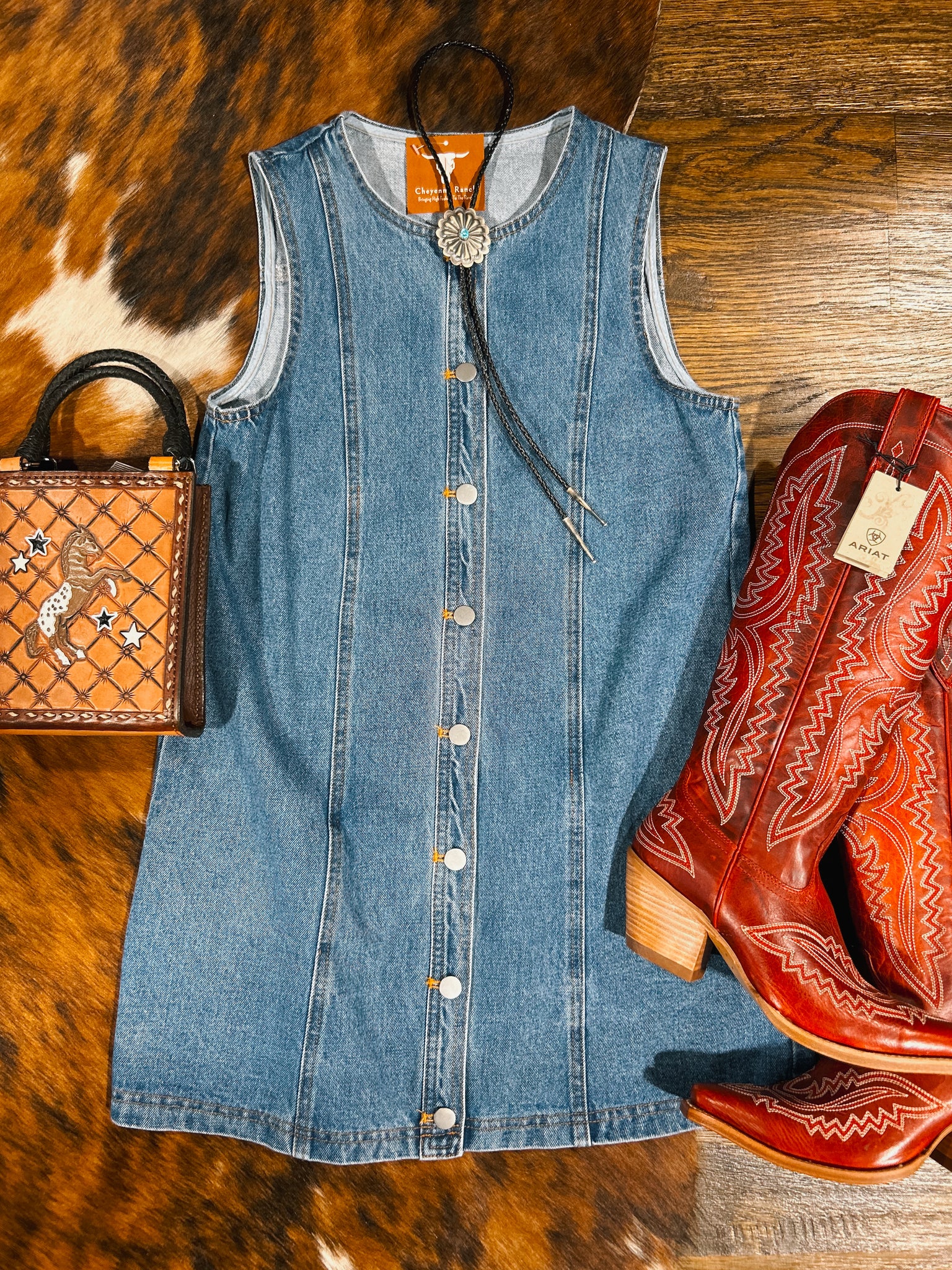 This adorable round neck button down denim mini dress is your go-to piece for effortless Western style. Wear it solo for a chic, casual look or layer it over a delicate lace long sleeve for added sophistication. Pair with tall boots and a wild rag to create the perfect outfit for date night or a night out on the town. Versatile, flattering, and undeniably cute, this dress transitions seamlessly from day to night.
