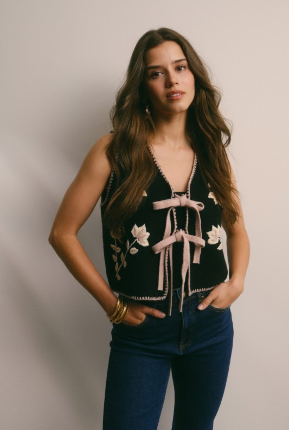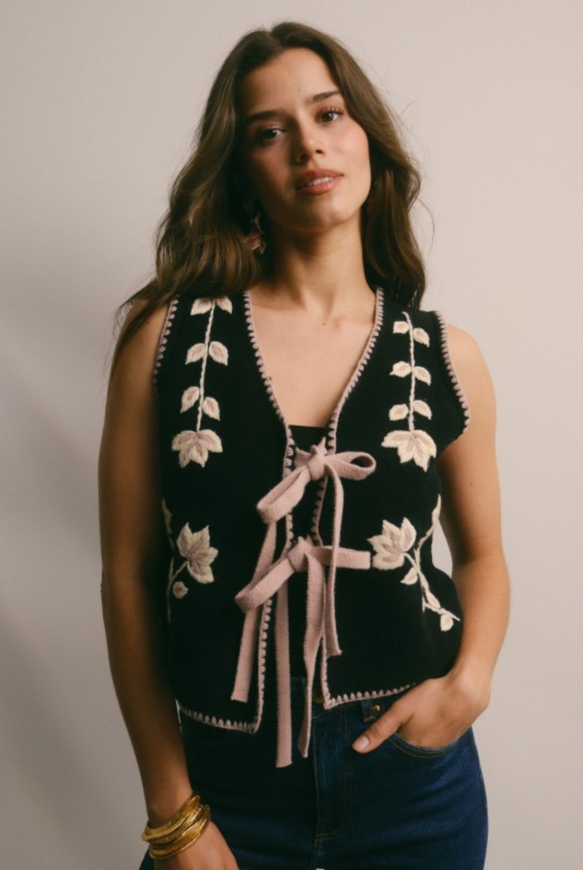 The Giselle vest brings effortless sophistication to your layering game. This cropped wool blend knit features delicate tonal floral embroidery that whispers vintage elegance, while dual front ties let you customize the fit to perfection. The plush, textured fabric drapes beautifully over dresses, high rise bottoms, or worn open with a simple tee. Whether buttoned for polish or relaxed for casual charm, this versatile piece transitions seamlessly through seasons. Cozy, chic, and endlessly wearable. The Giselle is the layering essential you didn't know you needed.