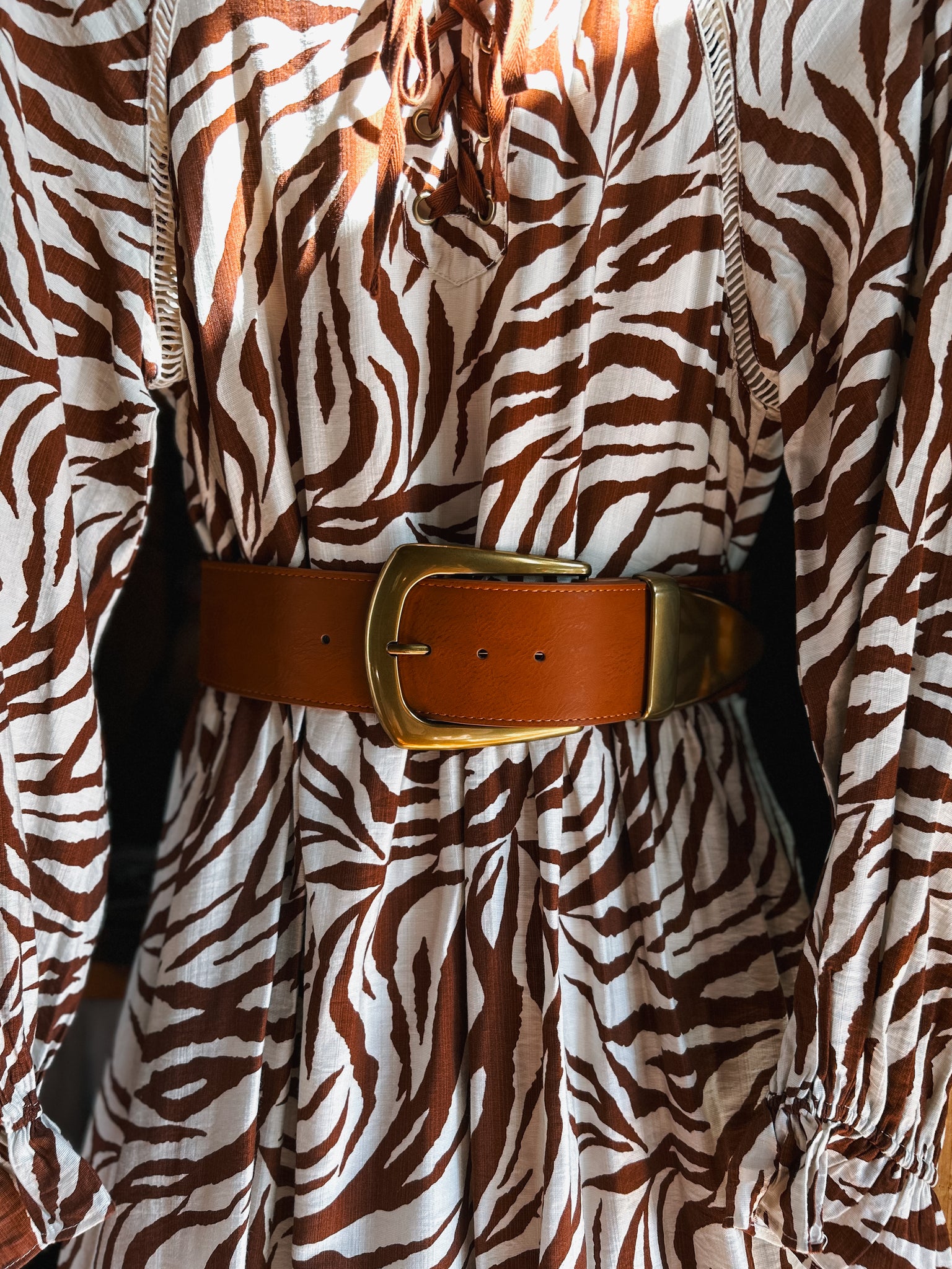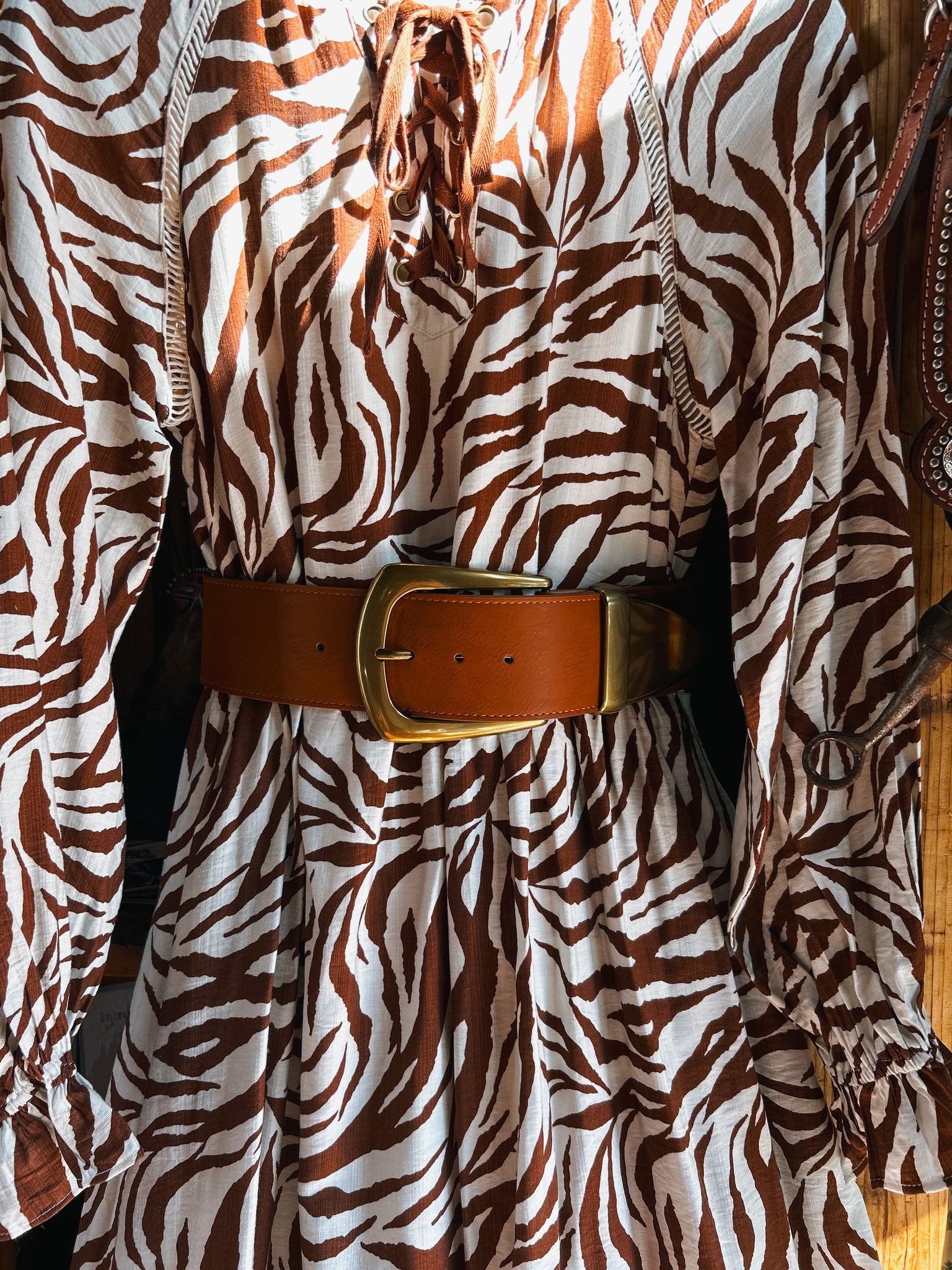 Introducing the Greer - Brown Wide Statement Buckle Belt. With its 4" X 3.6" dimension and statement design, this belt is the perfect finishing touch to any look. It may not fit through jean belt loops, but it adds the perfect touch of style and sophistication to any outfit.